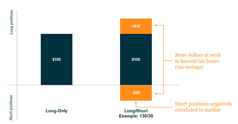 A new, more active form of tax-loss harvesting has emerged: long/short extensions. In a 130/30 example, the strategy purchases a 130% long position combined with a 30% short position, resulting in full market exposure (100%) but offering more opportunities for tax-loss harvesting.